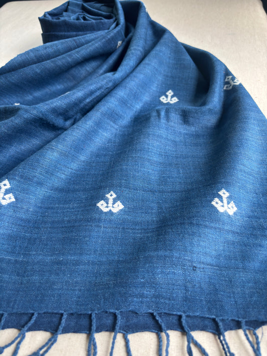 Blue Ahimsa Silk Scarf with White Motifs | Indigo Dyes