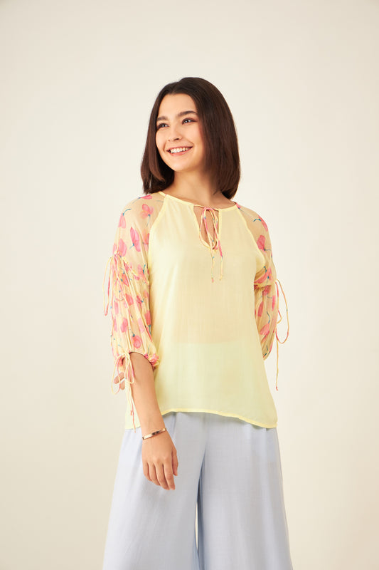 بلوزة بأكمام منفوخة مع ربطات باللون الأصفر الليموني