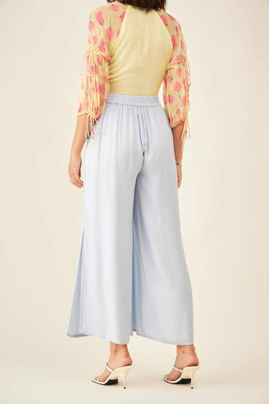 بنطال واسع باللون الأزرق الفاتح مع شق جانبي وجيوب