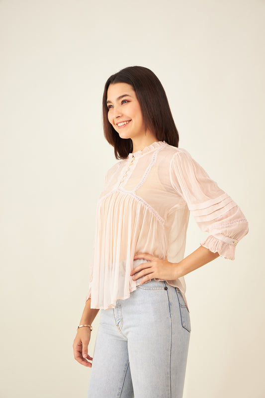 بلوزة شفافة بأكمام طويلة ومزينة بكشكشة باللون الوردي الخوخي