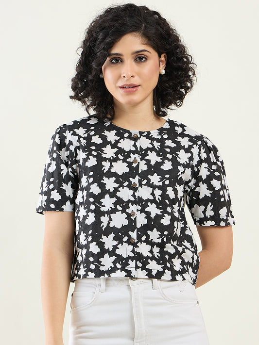 قميص نسائي قصير مزين بالزهور | أحادي اللون