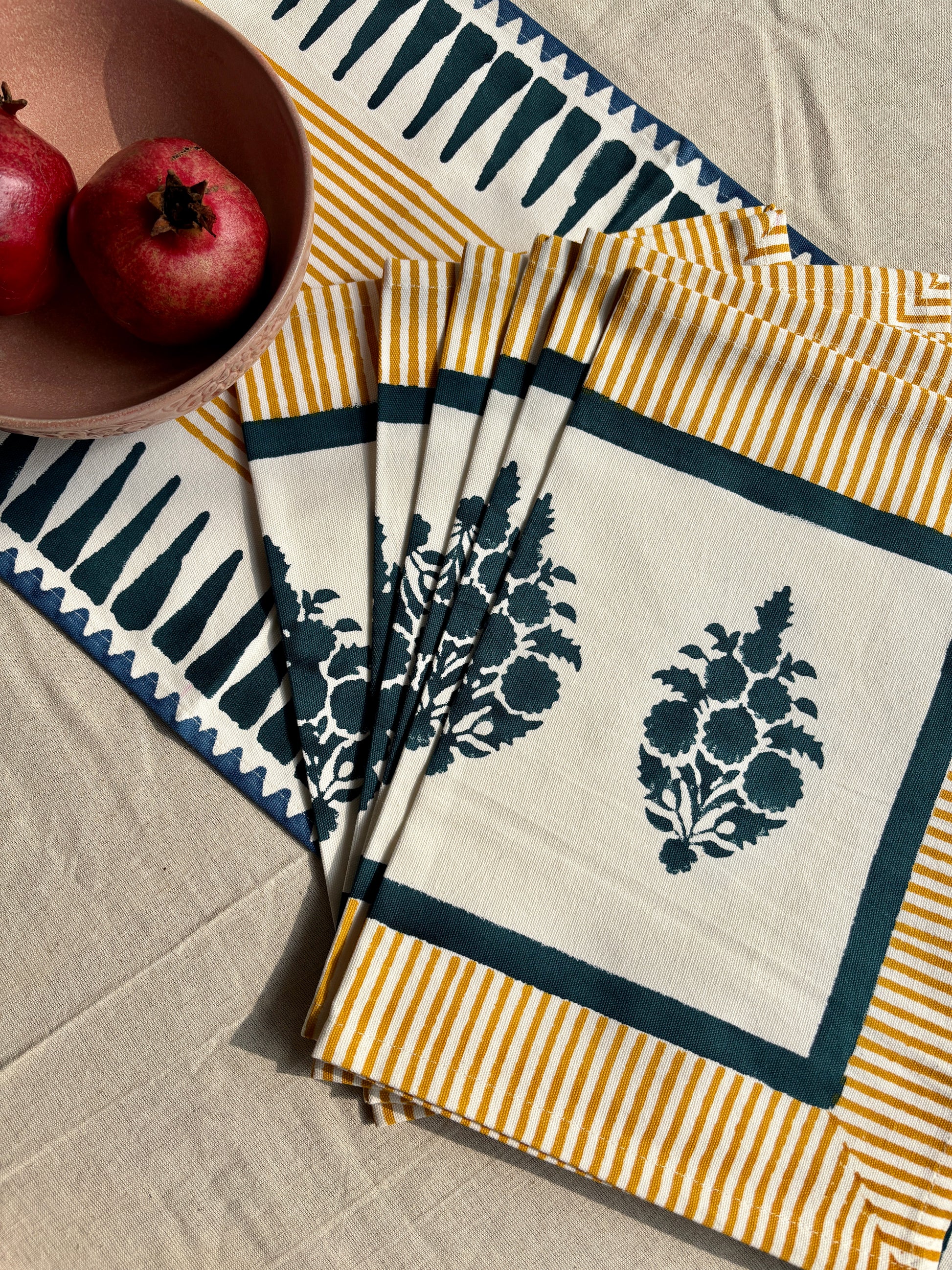 تتناغم درجات اللون الأزرق والأصفر في مزيج من مفارش المائدة المطبوعة بأشكال هندسية وزهور لإضفاء مظهر متطور على طاولتك. يتوفر مفرش متناسق.