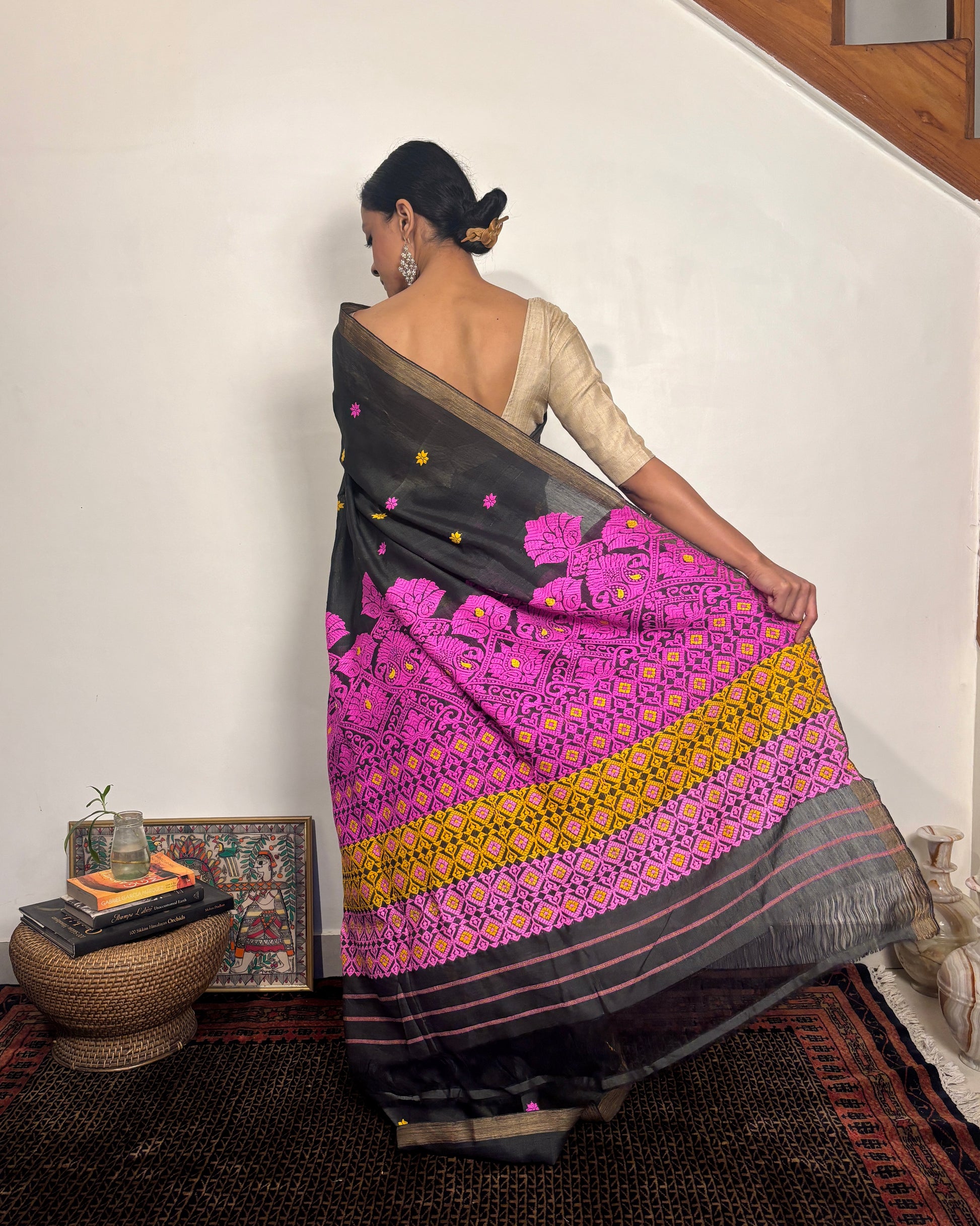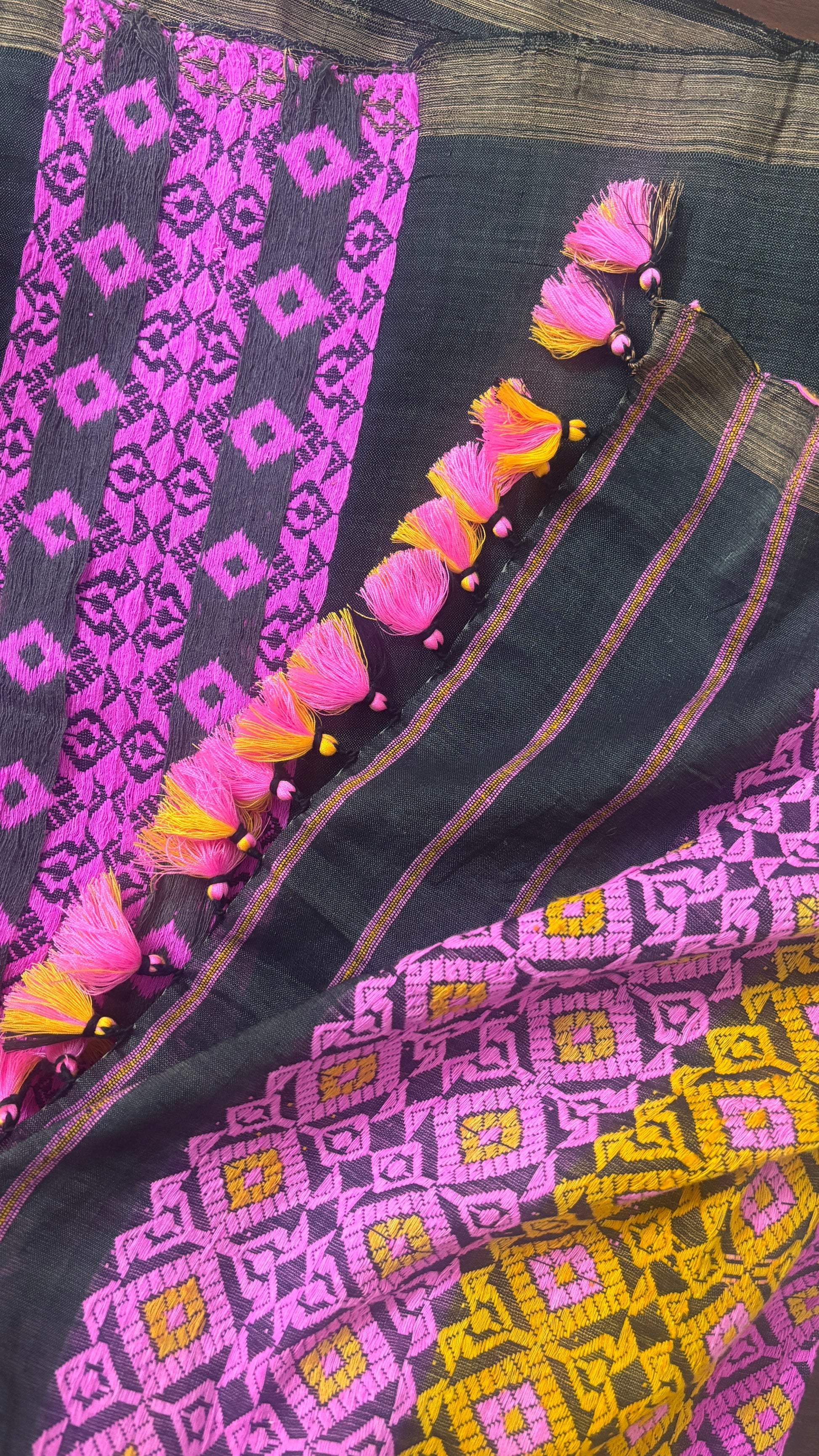 Raw Silk - Cotton Sari with Pink & Yellow Heavy Pallu | Black