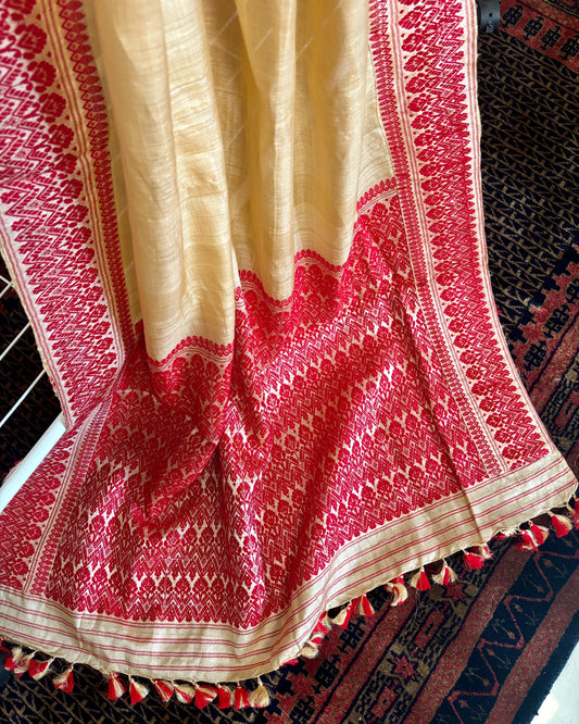Handloom Tussar Silk Mekhela Sador | Red and Gold