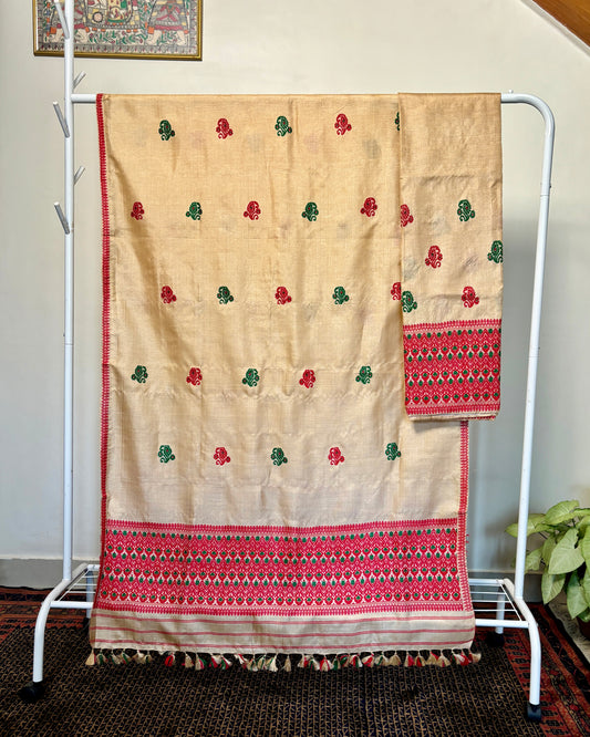 Handloom Tussar Silk Mekhela Sador | Red, Green and Gold