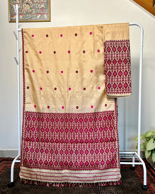 Handloom Tussar Silk Mekhela Sador | Maroon and Gold